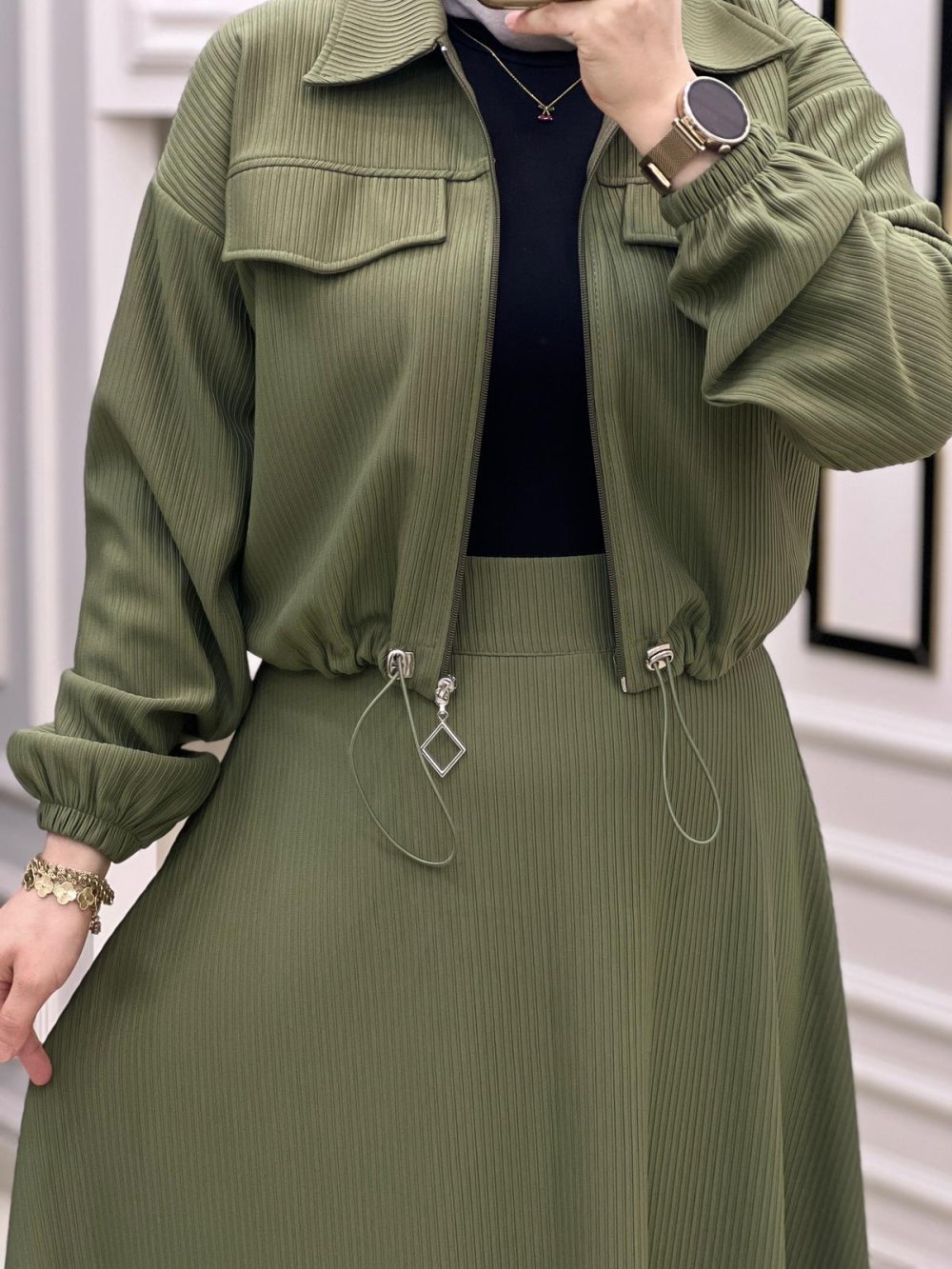 Tesettür Duru Ceket Etek Takım Şik ve zarif takımimiz Duru takım kod.13141 Ceket Beli ayarlanabilir şekilde lastikli Fiyat kargo ücretsiz Beden 38 40 42 44 Kumaş Türü:fitilli burgu Ceket boy: 45.47 cm Etek boy: 90cm Etek beli fermuarlıdir