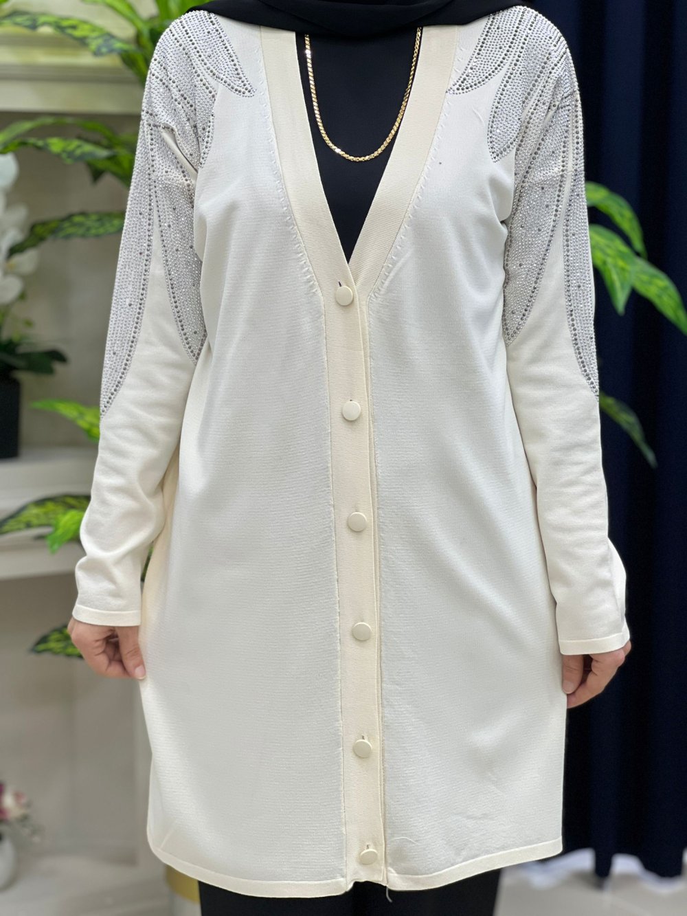 Yeni Sezon Müjgan Soğuk İplik Triko Hırka Ürün kodu Müjgan : 13136 Fiyat boy : 90 cm beden 38/46 uyumlu standart Kumaşımız 1.sınıf Soğuk iplik Triko düğmeli kol taş baskili