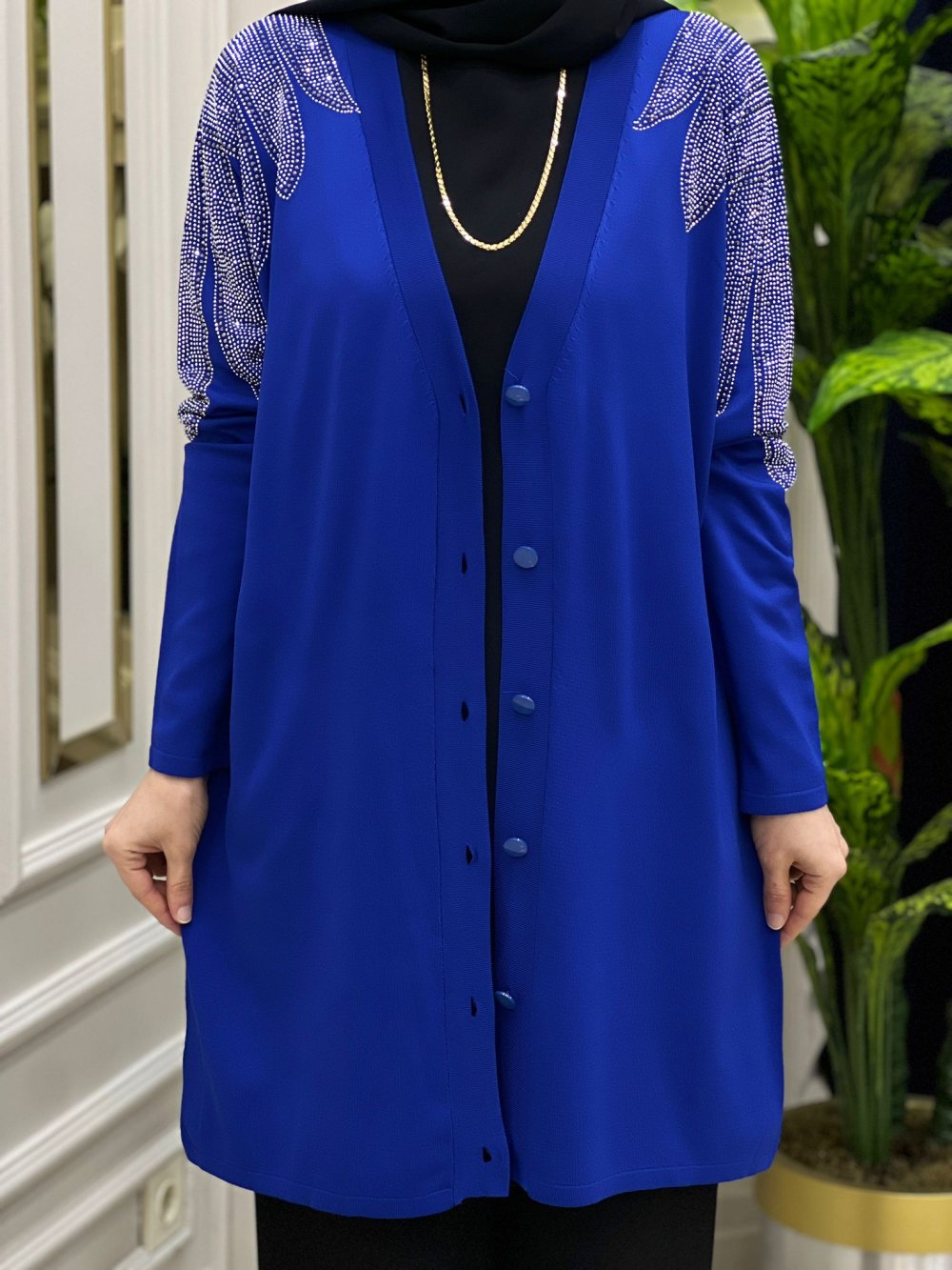 Yeni Sezon Müjgan Soğuk İplik Triko Hırka Ürün kodu Müjgan : 13136 Fiyat boy : 90 cm beden 38/46 uyumlu standart Kumaşımız 1.sınıf Soğuk iplik Triko düğmeli kol taş baskili