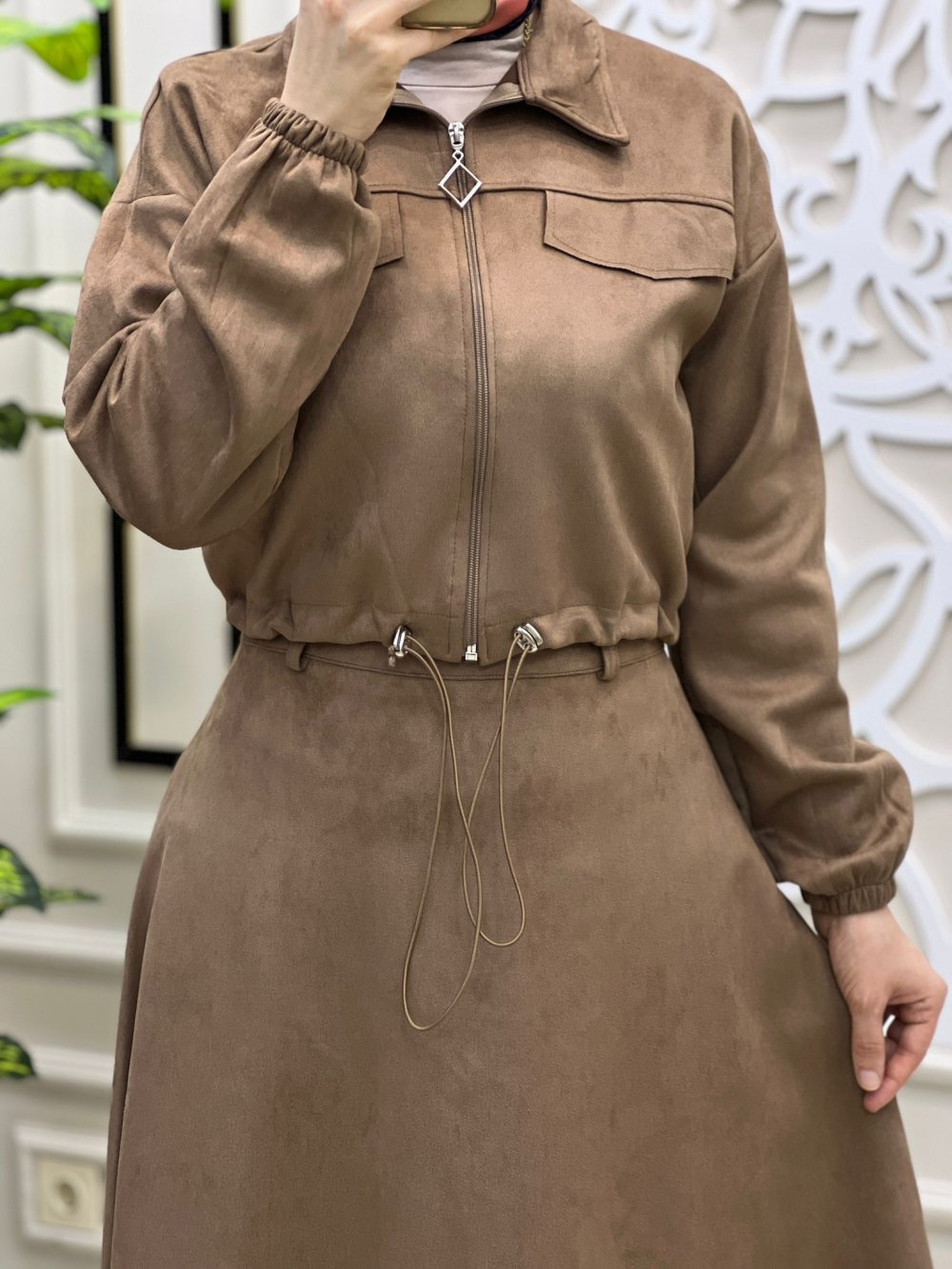 Tesettür Latte Ceket Etek Takım Şik ve zarif takımimiz Latte takım kod.13117 Ceket Beli ayarlanabilir şekilde lastiklidir kargo ücretsiz Beden 38 40 42 44 Kumaş Türü: Süet Ceket boy: 45 cm Etek boy: 85.87cm Etek beli fermuarlidir